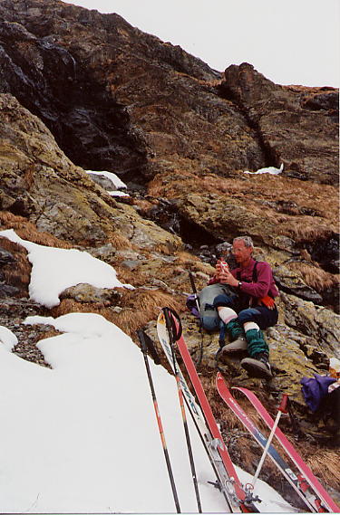 Et bien non : il faut déchanter. Surpris à la première barre, nous reprenons une traversée horizontale vers l'est, en espérant trouver un meilleur passage. Il apparaît en effet, et nous descendons jusqu'à un dernier petit mur (15m). Là on ne passe pas. En tout cas pas à skis, et à pieds l'affaire ne paraît pas simple !. Après différentes tentatives et discussions, nous décidons de tenter un petit rappel. Je rejoins l'emplacement de pose qui parait le plus évident, et là je trouve un piton avec un vieil anneau. On n'est donc pas les premiers !. C'est toujours réconfortant. Les opérations sont longues : d'abord les skis, ensuite les hommes avec les sacs. La corde a juste la longueur. Bon point pour l'équipement, mais celui-ci ne va pas jusqu'à prévoir le 8. C'est donc le rappel classique.