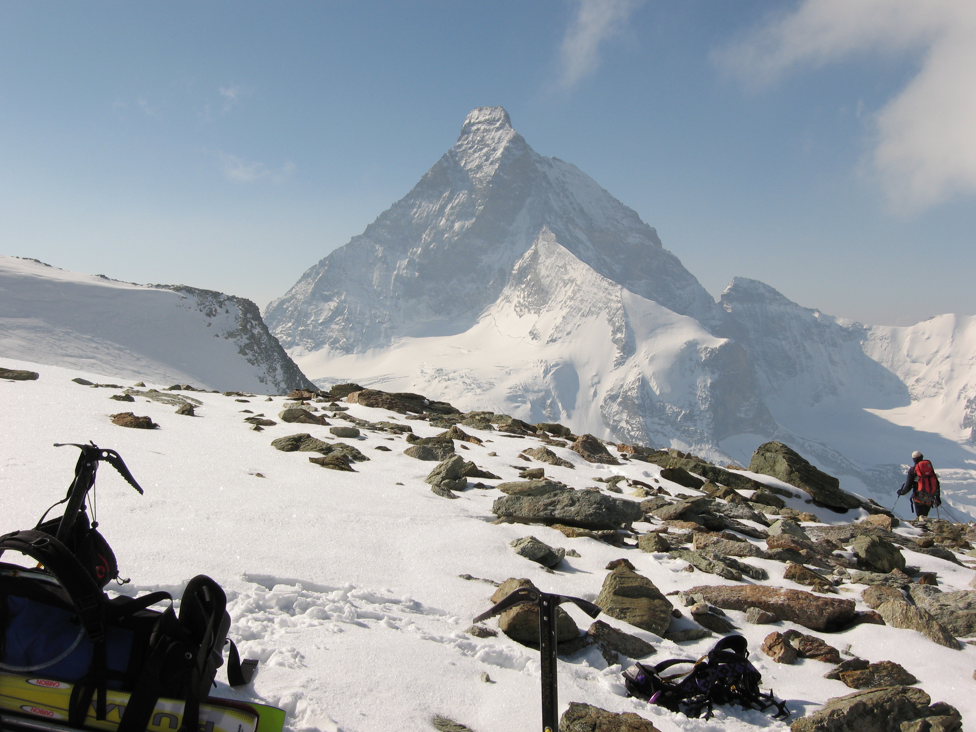 Nous aurons beaucoup porté durant cette randonnée. C'est d'ailleurs cette absence de neige qui va nous faire renoncer au retour par Zermatt. Nous préférerons la descente sur Arolla par le glacier homonyme et avec raison comme la suite le prouvera.