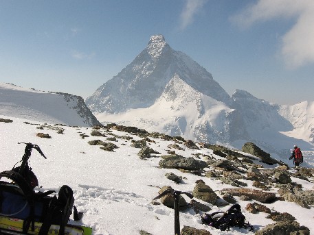 Cette année le glacier du Zmutt, aux pieds du Cervin, est complètement déneigé (pourtant nous ne sommes qu'en avril…) et il faut remonter la moraine menant à la Schönbiel hütte skis sur le sac. C'est lourd...