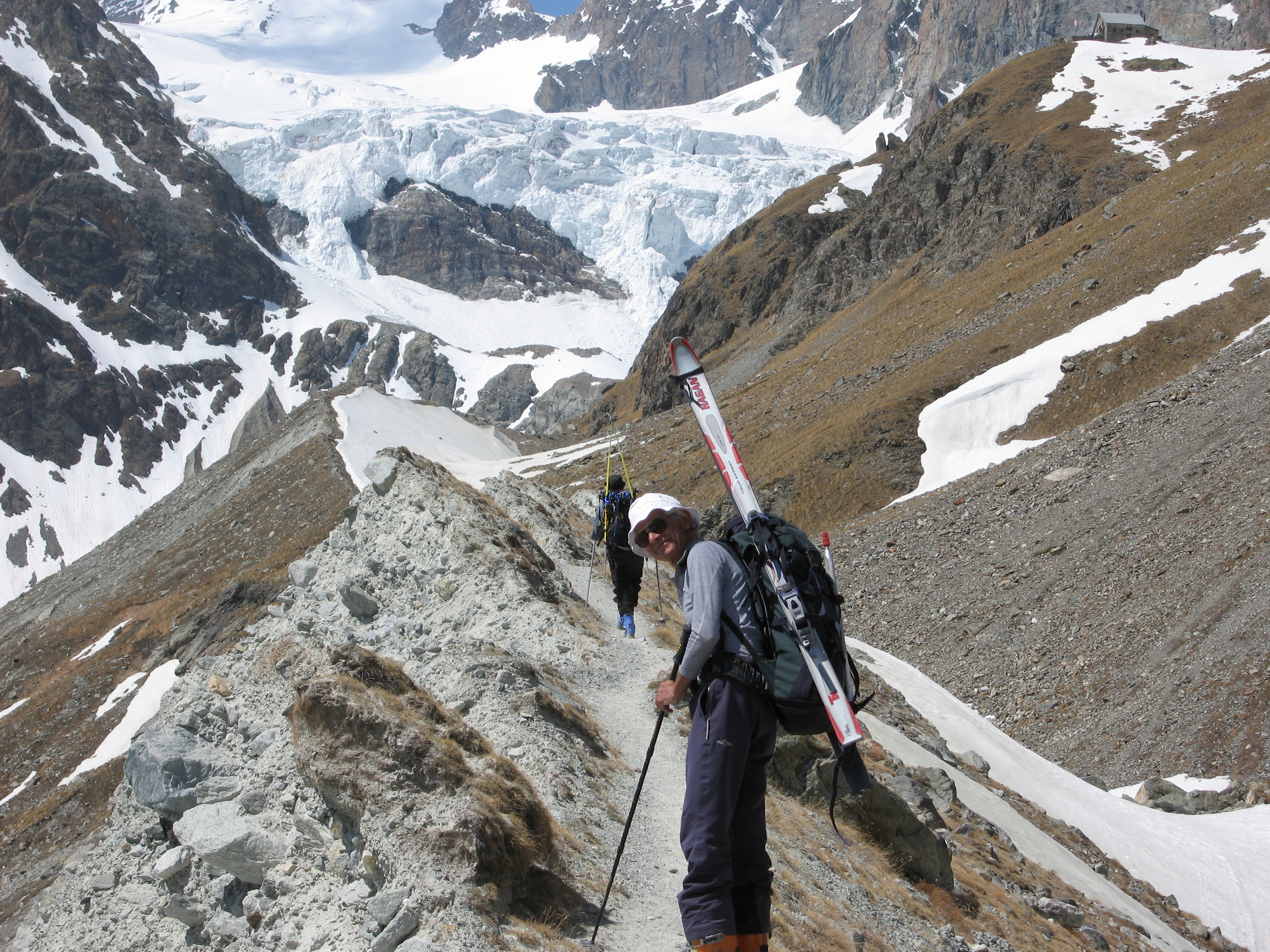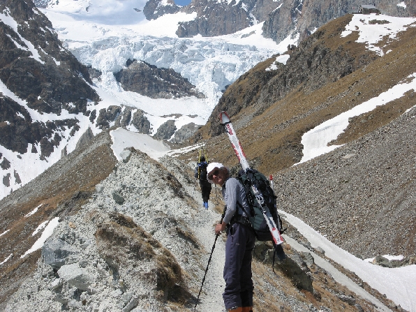 Le dernier jour sera long, puisque nous voulons rejoindre Arolla. Déjà ça commence fort avec la descente du refuge sur le glacier du Zmutt, skis sur les épaules, par un chemin escarpé et une caillasse qui vous coupe les jambes. Vraiment il ne faut pas aller à la Schönbiel hütte quand il n'y a pas assez de neige.