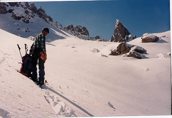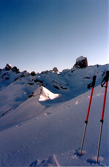 Mais pour cette fois, le beau temps était avec nous et le lendemain fut magnifique. Du refuge de la Coire, on monte au col du Coin (2398) et de là on fait une traversée en descente légère. On passe à l'aplomb de la Pierre à Manta. Il faut alors remettre les peaux pour enfiler les pentes qui montent au col du Bresson (2469).