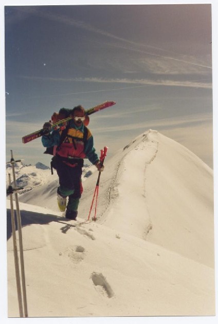 Après une nuit réparatrice, nous avons attaqué ce fameux goulet des Banchers. Ce n'est certainement pas un goulet à fréquenter quand il y a des risques d'avalanche, parce-que c'est justement un couloir d'avalanche. Mais nous étions au mois de mai et il n'avait pas neigé depuis un bout de temps. La montée est relativement facile à ski. C'est un goulet étroit, mais pas trop pentu et il se fait à force de conversions. La neige est même bonne, parce-que lissée par les avalanches qui y sont descendues. Après le goulet on arrive sur un immense plateau, le glacier de Méan Martin. Magnifique. Il faut ensuite rejoindre le col de Méan Martin et faire le sommet par la crête. Avec la neige de printemps qui s'était bien installée, la descente de Méan Martin sur le refuge de la Femma se révéla magnifique.