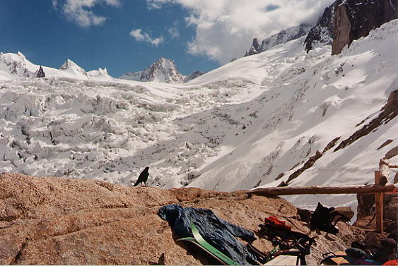 Le fond du glacier de Leschaux avec la splendeur des Grandes Jorasses est extraordinaire, mais il est trop perturbé par la bêtise des avions qui viennent s'exercer à atterrir sur la neige du glacier. Leur bruit résonne dans tout le crique des Jorasses et c'est vraiment insupportable. Je ne comprends pas que Chamonix accepte ce genre de nuisance. Les avions sont généralement interdits dans les montagnes françaises (voir l'Oisans ou la Vanoise) et il n'y a que dans le Massif du Mt Blanc qu'ils peuvent faire ce qu'ils veulent.