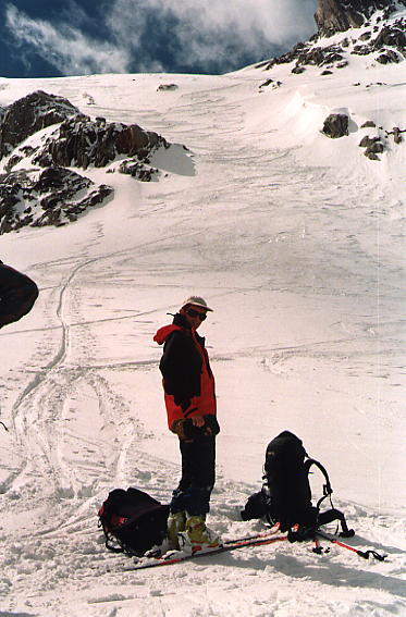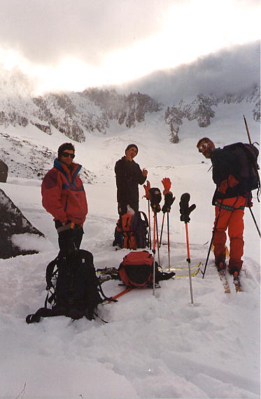 Le lendemain, il ne fait pas très beau, mais suffisamment pour que nous attaquions le glacier des Périades, vers l'Aiguille du Tacul. Certains ponts de neige en-dessous du Requin semblent faibles et nécessitent une assurance, ce qui prend toujours du temps, surtout à ski. Finalement nous irons le plus haut possible à ski, sans atteindre la bréche (accessible avec un peu d'escalade, mais il faut trouver le passage). La descente n'est pas très bonne, la neige étant lourde et mouillée. Il n'a pas gelé et cela sent le mauvais temps.
