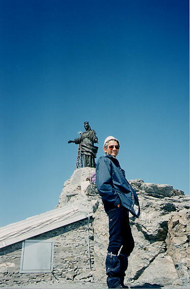En fait le sommet de Rochemelon apparaît tout-à-fait sauvage et hostile. Il y a toujours la grande statue de la Vierge. Vers l'Italie la pente descend à pic. Je me penche pour repérer la fameuse esplanade avec la chapelle et le refuge attendu, mais la pente est toute enneigée, toute lisse et bien raide, 1000m de vide. Pas l'ombre d'esplanade et encore moins de refuge. C'était presque comme si j'avais révé de cette esplanade visitée en été.