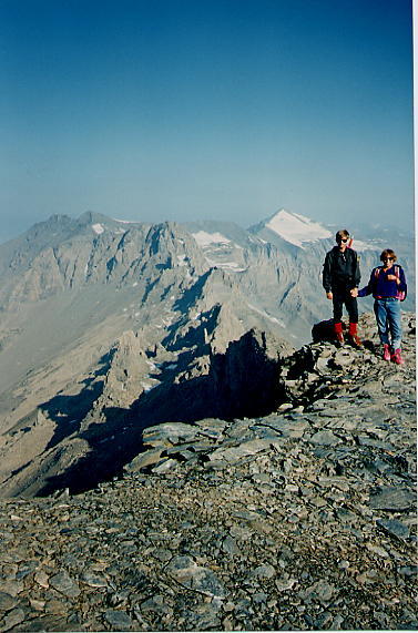 En arrivant au col du Mont Tour (3385), on trouve un vent violent et le brouillard. Il faut y aller au jugé. En fait il faut éviter de descendre (raide puis barres) et suivre la crête. Après avoir suivi longuement cette crête, il faut bien repérer le raccord (descente) pour rejoindre le glacier de Rochemelon et ensuite le col de Novalèse (3229). Le temps est de plus en plus bouché et il commence à neiger. Le sommet se monte par l'arête Nord Ouest. Beaucoup de vent, mais on se dit que de toute façon il y a un refuge au sommet, donc le confort...