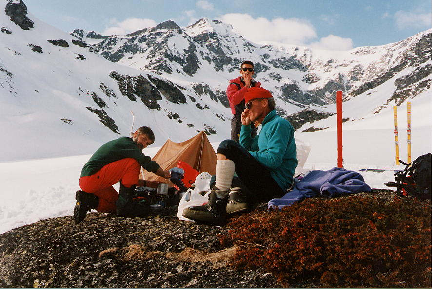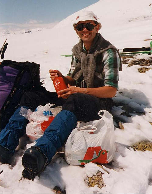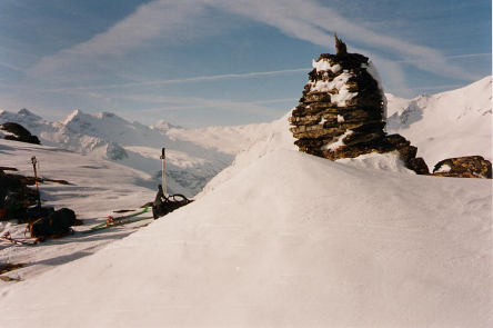 De Bourg St Maurice, on monte en voiture au village du Crot (1505), au-dessus de Ste-Foy-Tarentaise. Il y a un peu de portage, mais on peut chausser en dessous du refuge de la Motte. Pas d'arrêt au refuge, on continue jusqu'au col du Mont (2636), où nous nous octroyons une petite pose. Jean l'apprécie beaucoup comme le montre la photo.