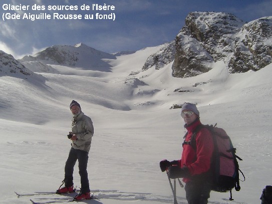 Nous quittons cet excellent refuge après deux nuits et deux bouteilles de Mondeuse pour tenter la Gde Aiguille Rousse et le passage par le col du Montet. Au petit matin, le temps est encore avec nous malgré un vent assez fort. Il faut rejoindre le beau glacier des sources de l'Isère pour le sentir s'apaiser un peu. Nous sommes seuls et l'ambiance est au rendez vous.