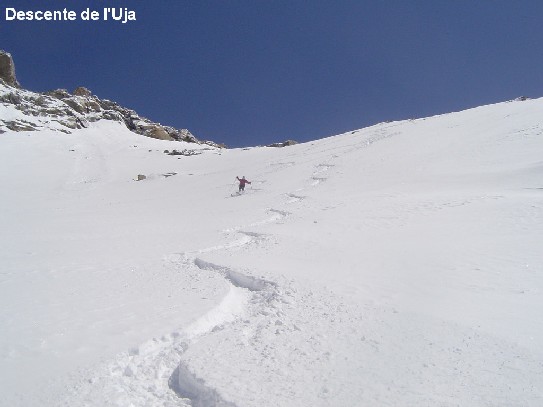 Encore une fois je ne pourrai pas terminer laissant ce soin aux autres. Mais la descente est excellente. Il a neigé la nuit et c'est une poudreuse de rêve. Jean s'en donne à coeur joie et sa godille fera de l'Uja un souvenir.
