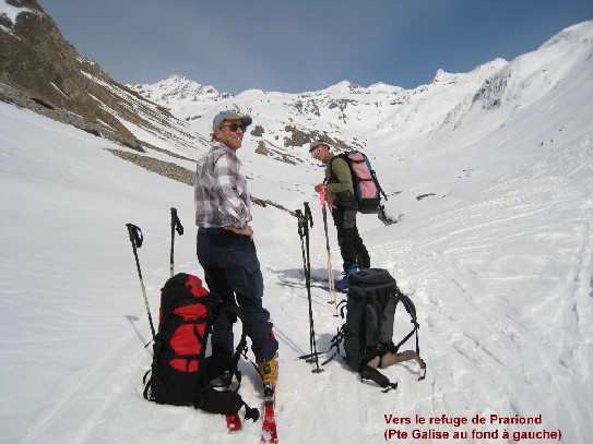 Le circuit envisagé en Vanoise avait l'avantage de se concentrer sur deux refuges gardés, avec retour au point de départ, Val d'Isère. Le regroupement des participants fut compliqué mais s'avéra finalement très simple. Jean arrivait de Paris par le train du matin, j'avais rendez vous avec le gapençais Bernard à Aspres sur Buech, moi-même arrivant de Valbonne en voiture. Tous ces rendez vous se sont réalisés ! De Bourg St Maurice nous nous tassons tous les trois dans ma petite Clio pour se retrouver au Fornet, limite du déneigement. Il faut chausser au milieu des skieurs de piste et nous ne trouvons la tranquilité qu'après avoir passé le pont St Charles et s'être engagés à pieds sur le chemin d'été du Prariond (après avoir tenté le passage de la gorge). On rechausse en haut de la gorge.