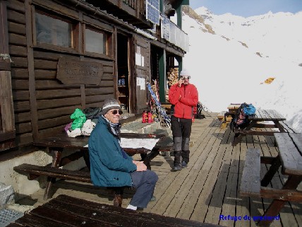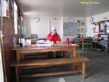 Le refuge Carro est extra. Refait à neuf, il offre des petites chambrées où nous sommes encore une fois tous les trois seuls. Mais surtout la gardienne, Véronique, est un amour. Elle est toute jeune, elle aime son refuge comme s'il lui appartenait. Je ne pensais pas qu'une jeune fille puisse aimer rester des semaines toute seule perdue dans la montagne enneigée. Son copain monte la voir de temps en temps, les weekends. Elle a arraché ce gardiennage au CAF de haute lutte nous a-t-elle raconté et elle ne semble pas prête à abandonner. Elle a même approvisionné une petite bibliothéque, ce qui est très sympa pour passer les après-midi en attendant le repas du soir. repas excellent d'ailleurs, toujours bien arrosé de Mondeuse (encore deux bouteilles !).