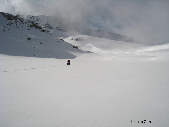 Nous partons un peu après, mais le brouillard est toujours là. Il se lève petit à petit laissant apparaître le lac du Carro sur lequel nous avions tendance à tourner en rond...
