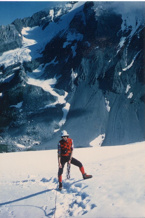 Il faut, maintenant, commencer la traversée du glacier et un problème se pose : nous sommes six et nous n’avons qu’une corde, qu’une paire de crampons et qu’un piolet; pour moi, le but est atteint, j’ai mis un pied sur le glacier et je décide de redescendre; l’une des grands-mères se propose de faire de même mais la seconde voudrait bien continuer. C’est donc quatre personnes qui vont s’encorder : Jean-Pierre, la vieille dame, Bernard et Claude.